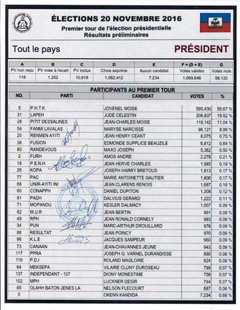 Selon les résultats préliminaires que vient de communiquer le Conseil Electoral Provisoire (CEP), Jovenel Moïse, candidat du Parti Ha’tien Tet Kale (PHTK) a obtenu 595,430 votes soit 55.67% des voix lors du scrutin du 20 Novembre 2016 devançant Jude Célestin de LAPEH avec 208,837 votes (19.52%, Moyse Jean-Charles de Pitit Dessalines avec 118,142 votes (11.04%), Maryse Narcisse de Fanmi Lavalas avec 96,121 votes soit 8.99 %, Jean Henry Céant de Renmen Ayiti avec 8075 votes (0.65%).